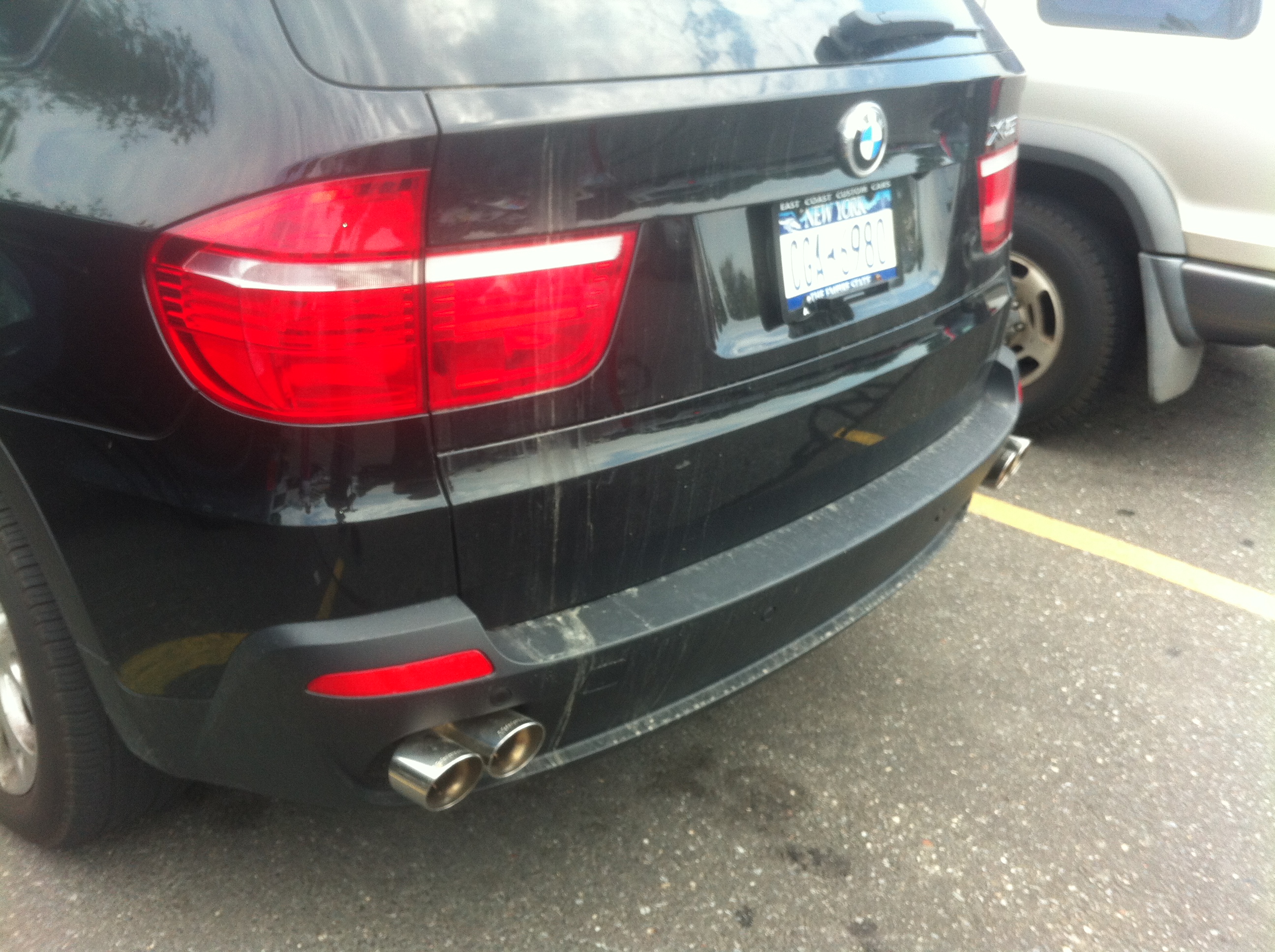 What you see in this picture is not just an ordinary BMW X5 4.8, it is paired with a very unique quad exhaust system manufactured by Meisterschaft. Most people are quite un-aware of how limiting factory exhausts are to both the economy and the power of an engine. It is a breath of fresh air to know that their are at least few enthusiasts who actually go to the trouble and install modifications to their vehicles. Meisterschaft makes some of the best exhaust systems for BMWs and Audis alike too. This combo of naturally aspirated V8 and performance exhaust is a really awesome sounding symphony of power and volume. Nice. Too bad he/she doesn’t keep their car clean 🙁